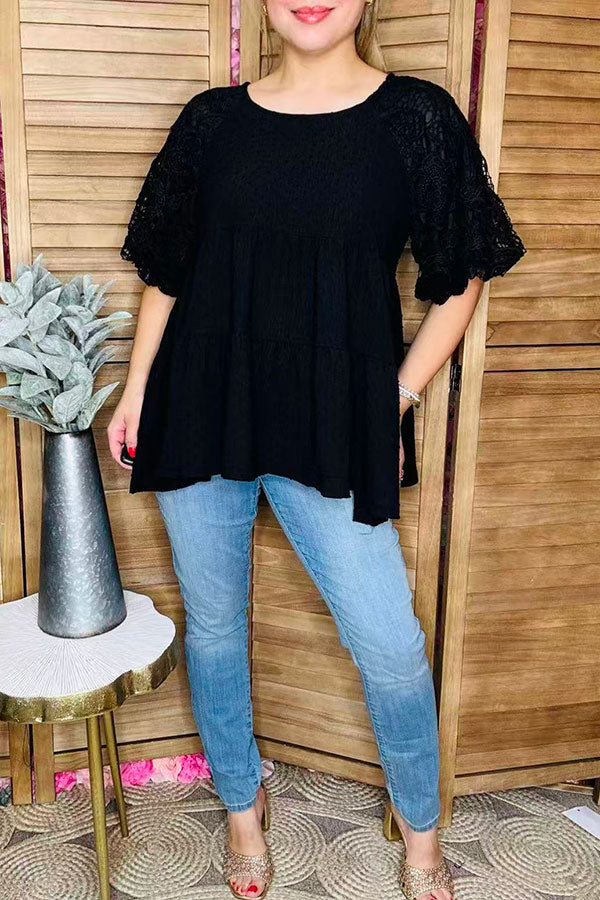 Black polka dots & lantern lace half sleeve baby doll women top XCH16340 BS6