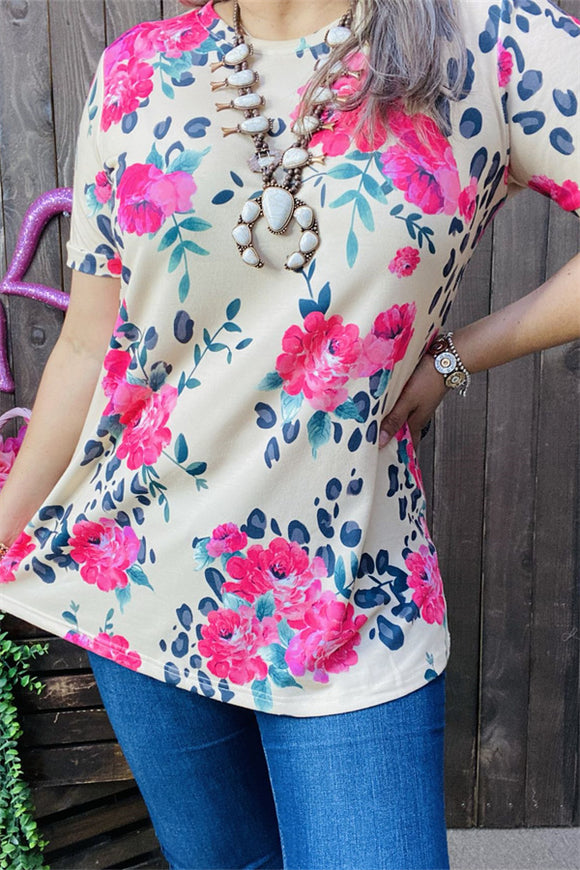 GJQ14377 Fuchsia Floral& leopard multi color printed short sleeve women beige tops (FS2)