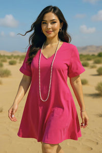 - Dress features solid color hot pink with turned short sleeves, v-neckline and pockets