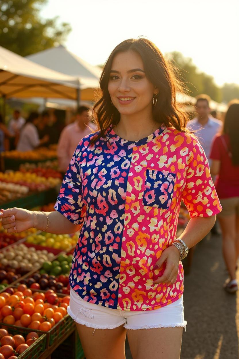 - Top features with half blue leopard & half red/orange leopard printed & short sleeves and front pocket.