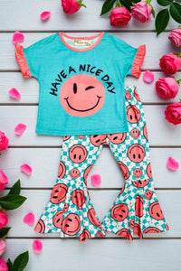 - Top features with "HAVE A NICE DAY " & pink smile face printed on mint background with ruffle short sleeves.