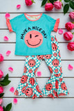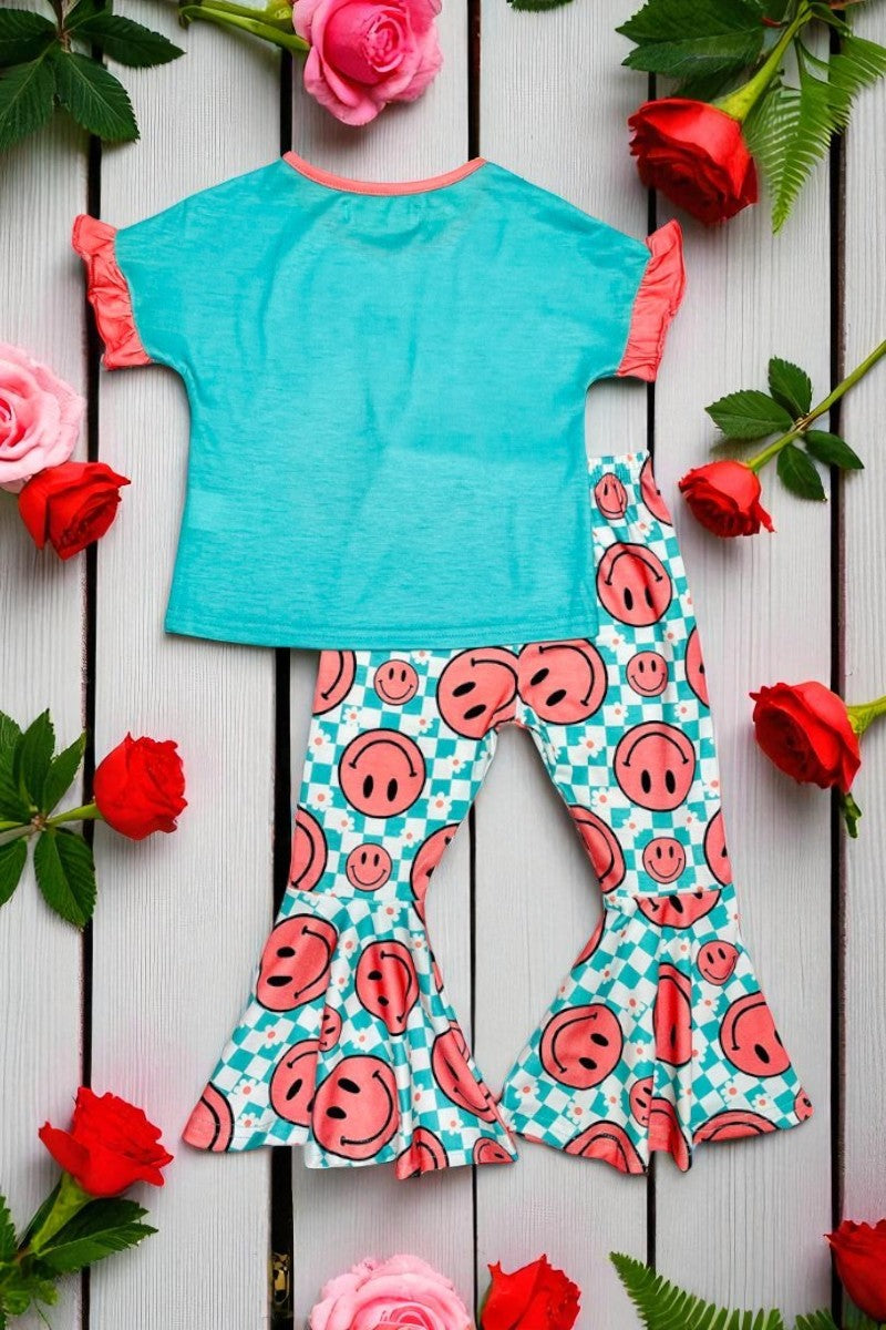 - Pink smile face & mint checkered printed bell bottom & flare legs.