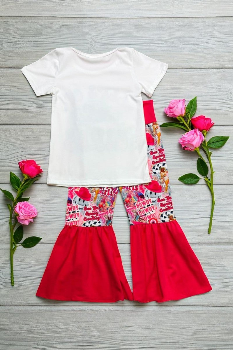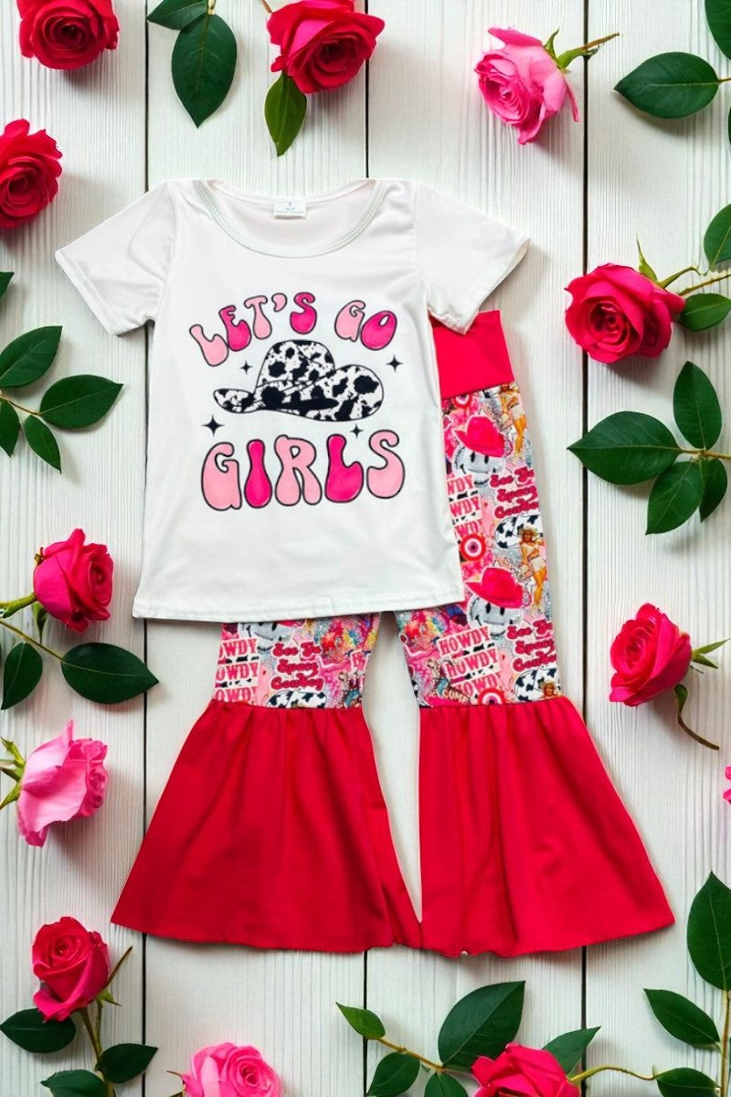 "LET'S GO GIRLS" white top hot pink bell bottom girls set 1137WY (A5S10)