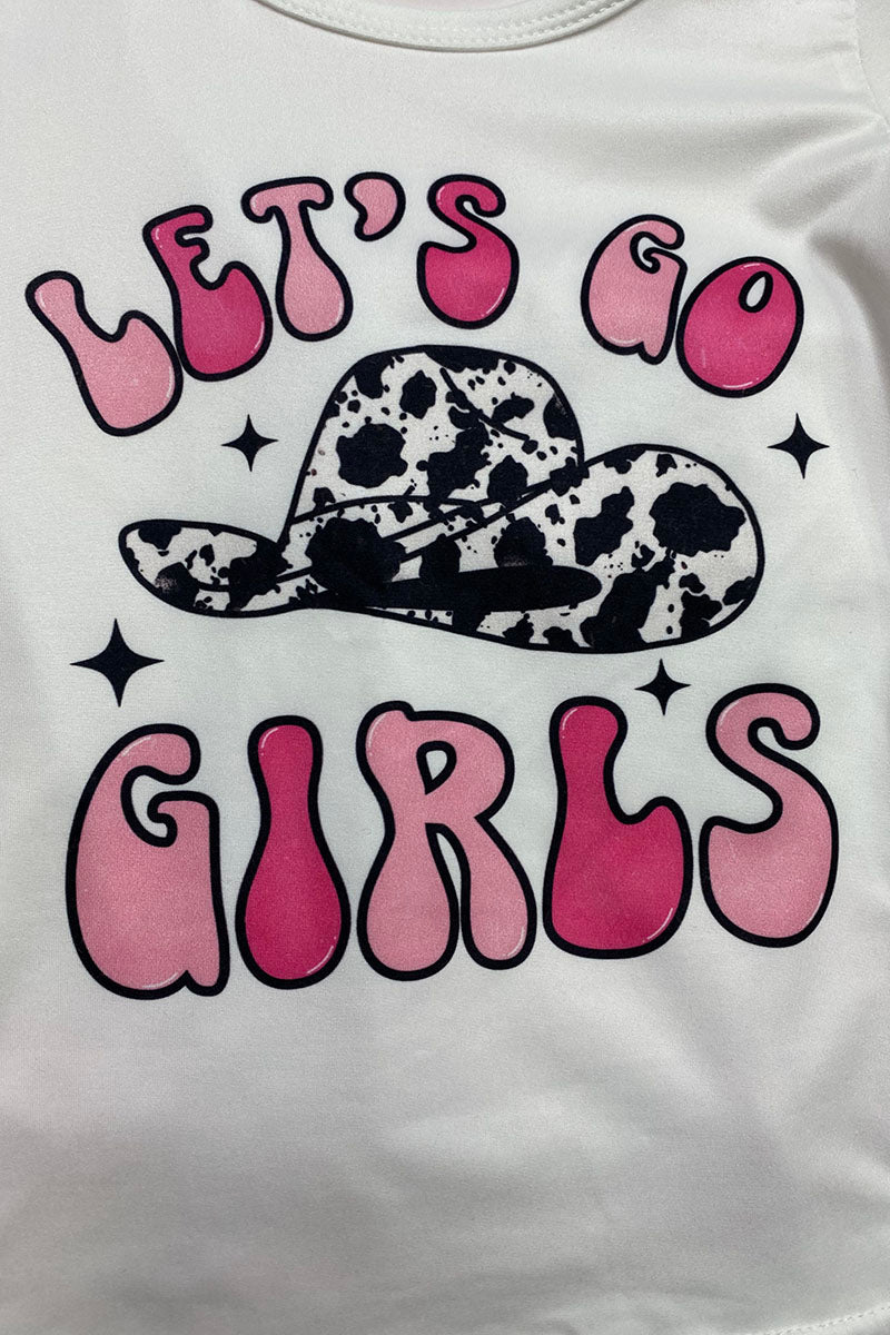 • Top features "LET'S GO GIRLS" wording w/cow print cowboy hat logo on solid white background & short sleeve cut.