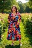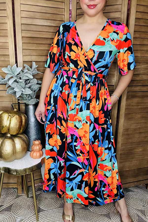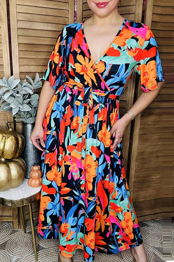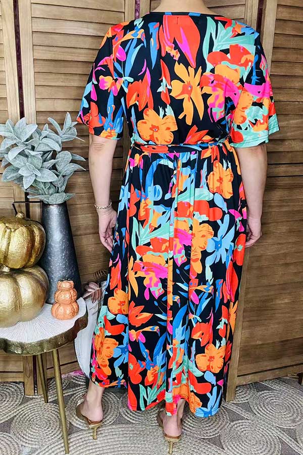- Dress features with multi color floral printed with short sleeves and v-neckline & adjust belt.