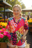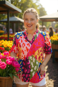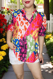 - Top features with color block leopard prints & short sleeves & V-neckline.