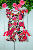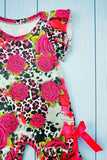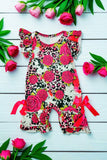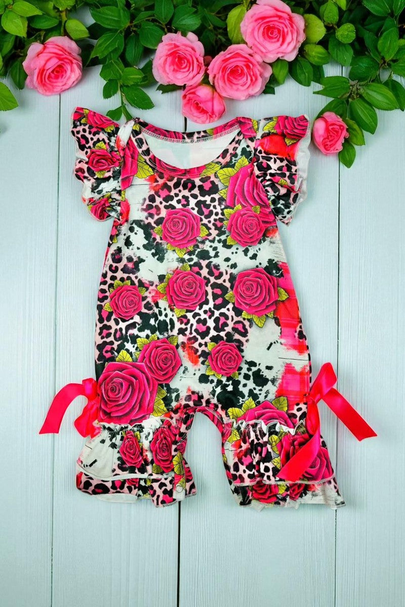 - Romper features with pink leopard and flower printed with ruffle short sleeves & snap buttons and ribbon at bottom.