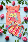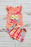 • Top features with plaid owl embroidery with bow on the coral background with flutter ruffle sleeves.
