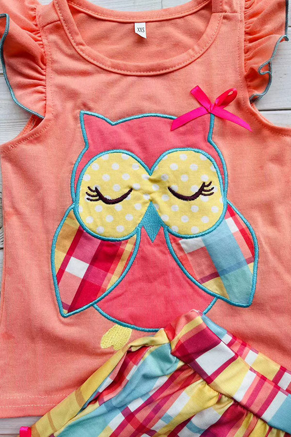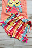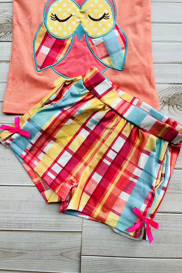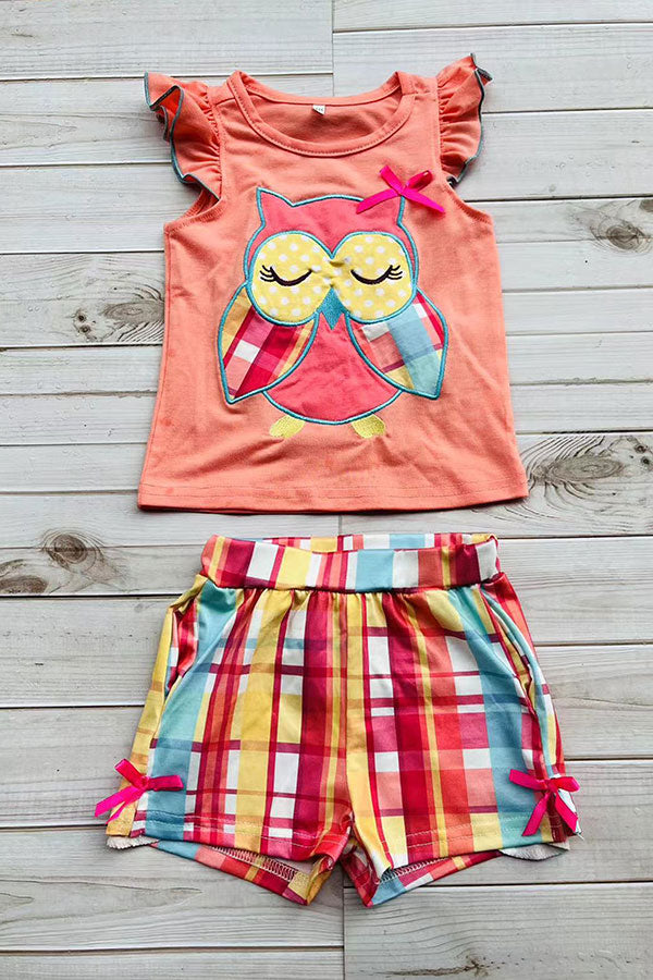 Plaid owl embroidery coral top shorts 2pcs girls outfit sets DLH2883 A3S5