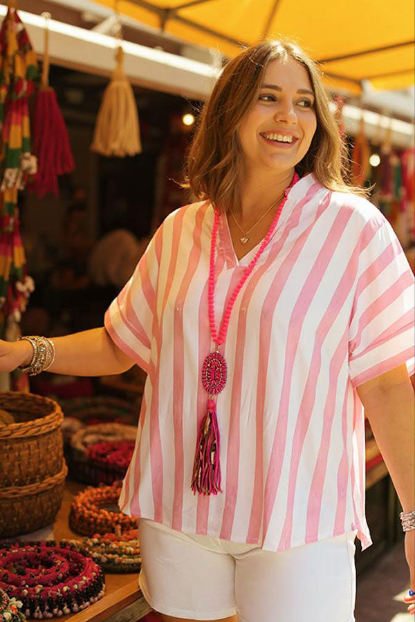 - Top features with pink & white striped with v-neckline and short sleeves in loose cut.