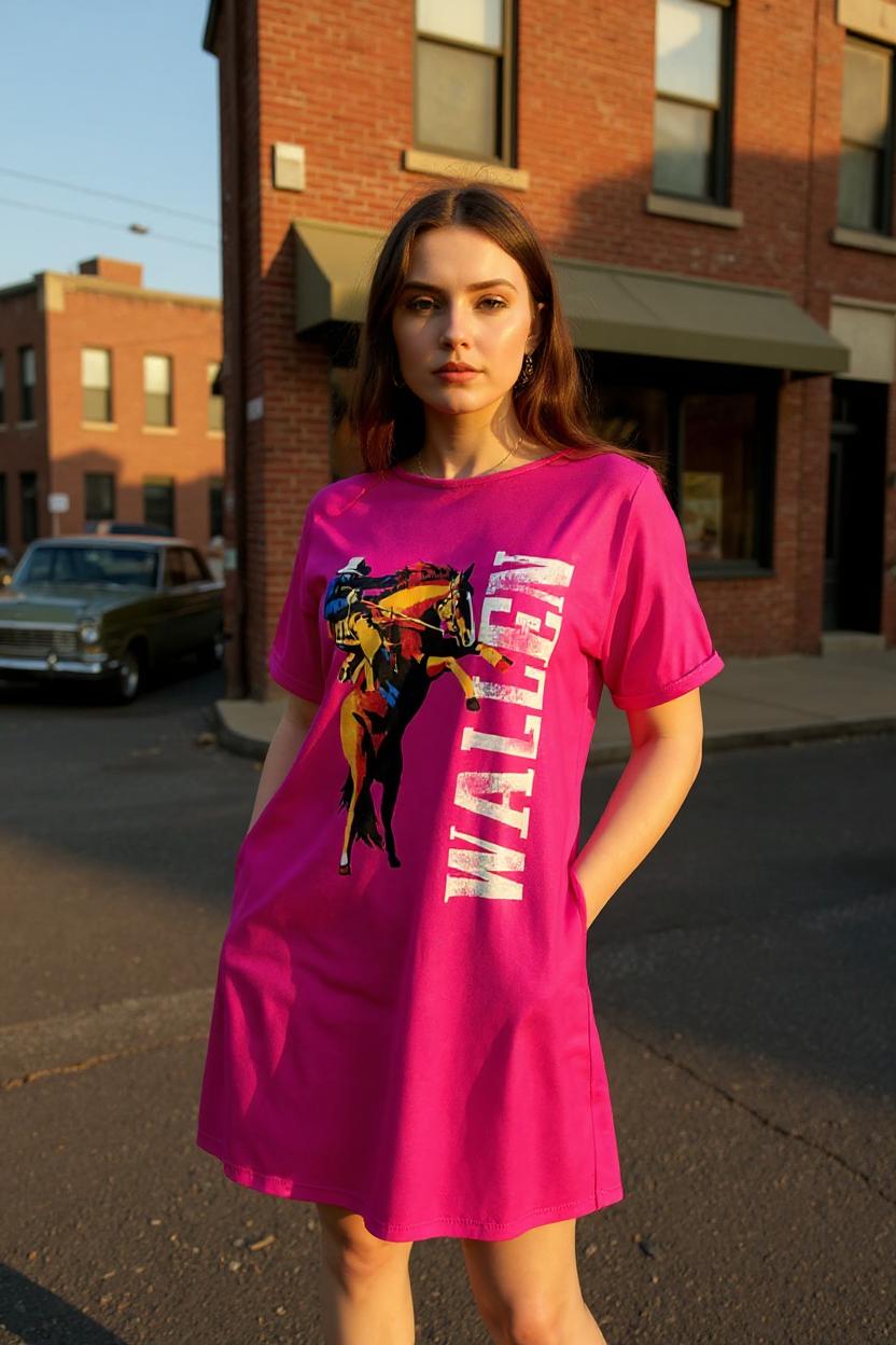 - Dress features wording WALLEN and riding horse prints on fuchsia background with short sleeves.