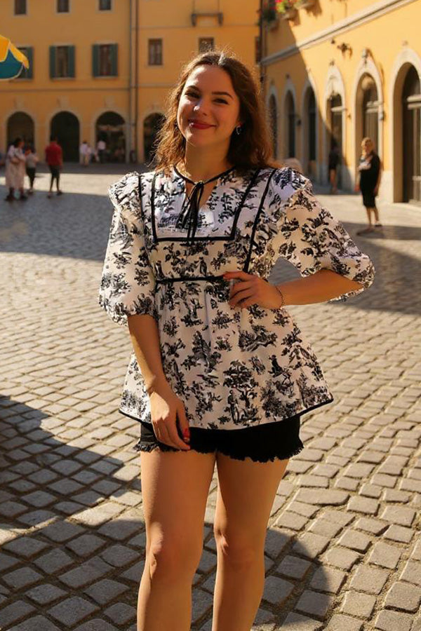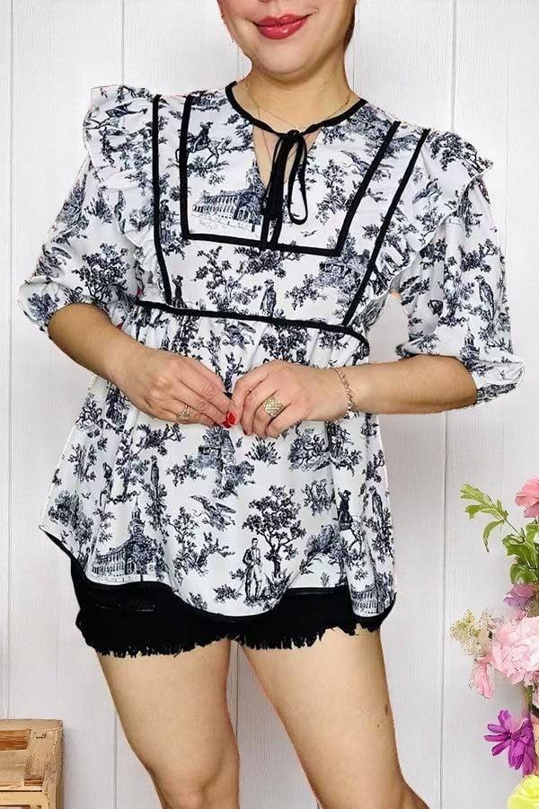 - Top features with white/black western printed & black trim & 3/4 sleeves with baby doll cut.
