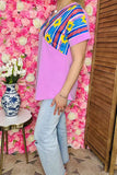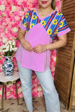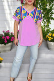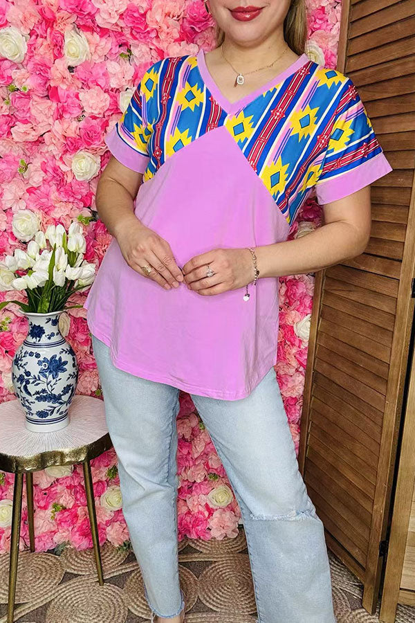- Top features with multi color aztec printed & purple color block with short sleeves.