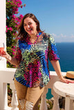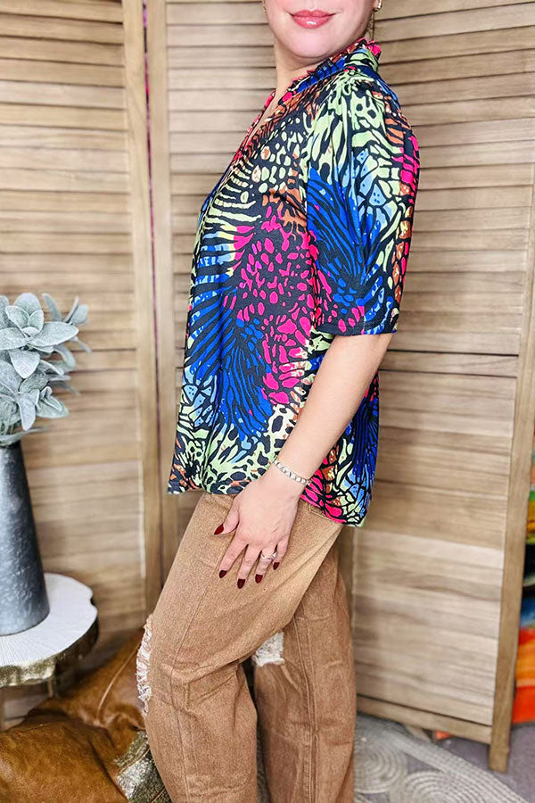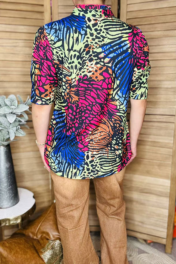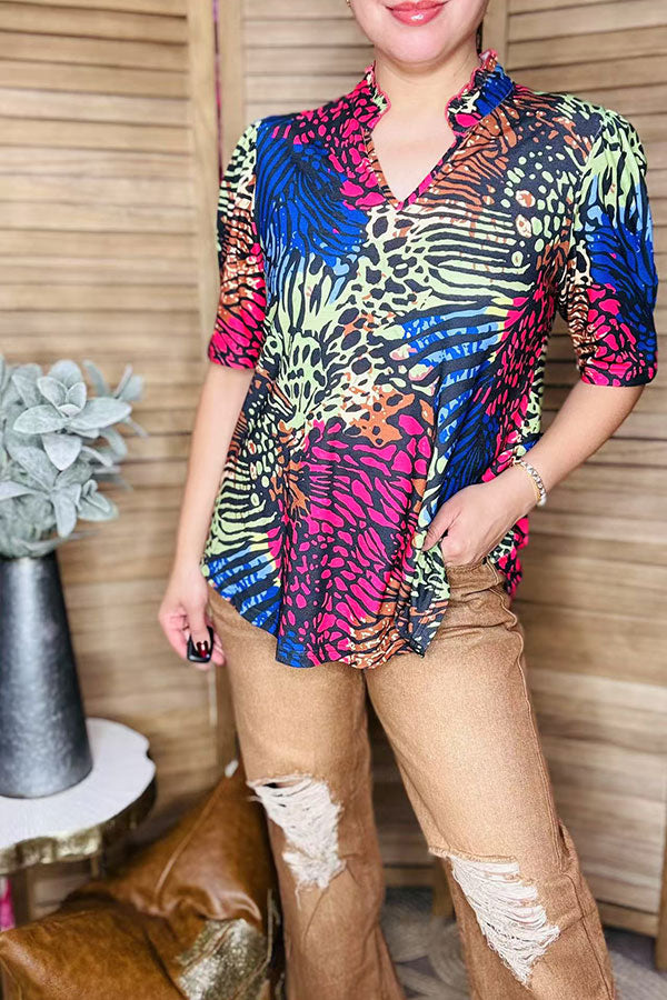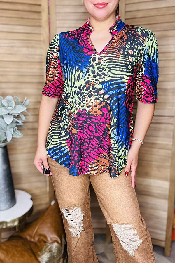 - Top features with multi color leopard & zebra animal printed with puff & wide half sleeves and v-neckline.