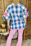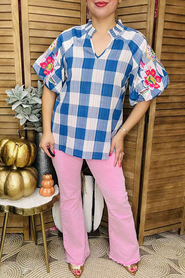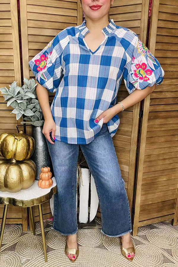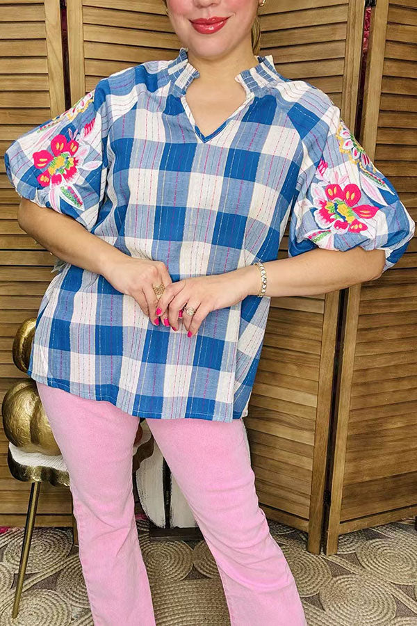 - Top features blue & white plaid cotton fabric with multi color floral embroidery on raglan puff sleeves & V-neckline.