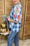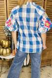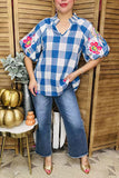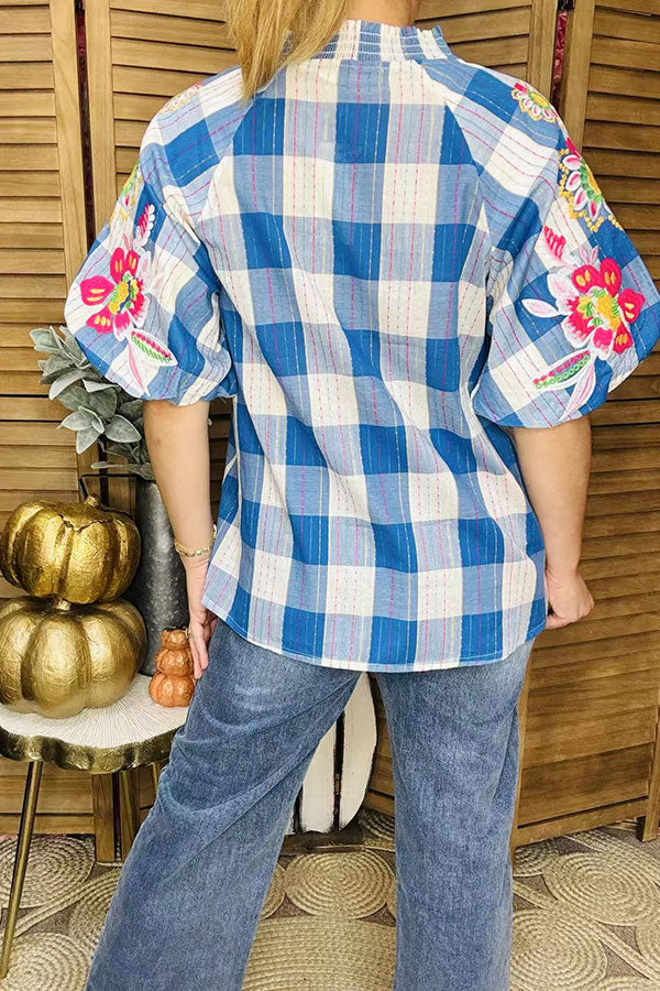 Western floral embroidery cotton plaid raglan puff sleeve women blouse XCH16214