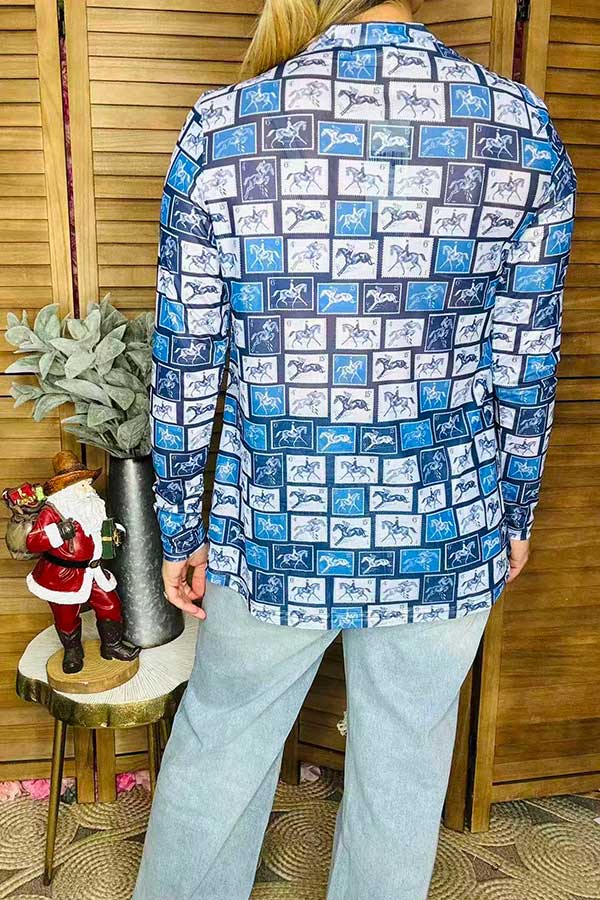 Western horse riding printed mesh sheer long sleeve blue women top XCH16584