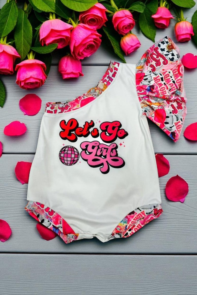 - Onesie features "LET'S GO GIRLS" wording w/a disco ball logo on a white background & one ruffle sleeve cut.