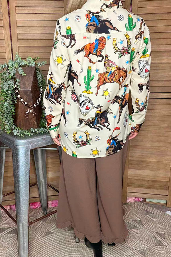 Western pattern printed beige long sleeve women shirts with buttons up GJQ16673