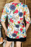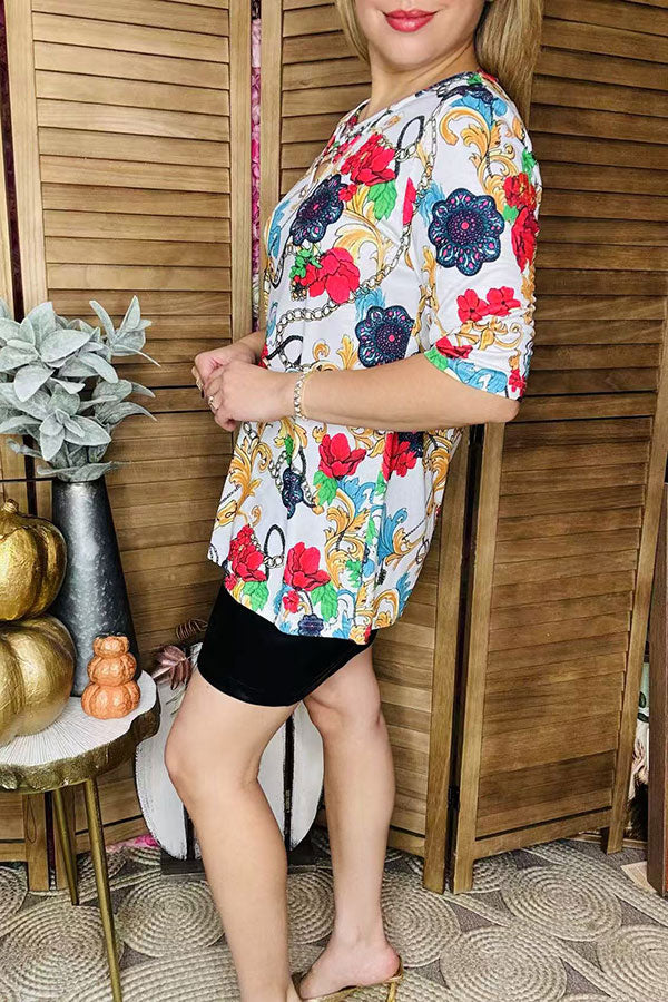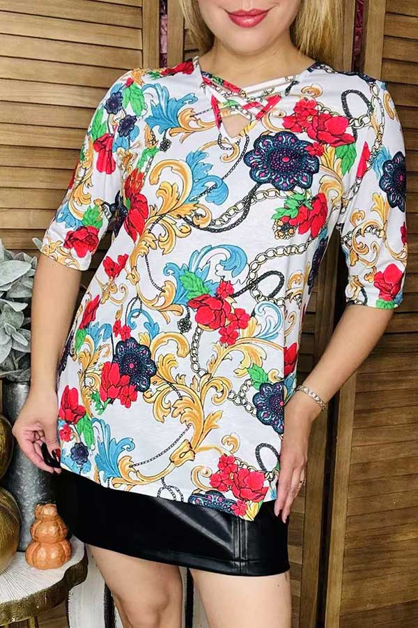 Top features with paisley & floral printed on white background with cross v-neckline and half sleeves. Suppply for women's boutique clothing wholesale.