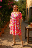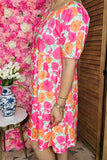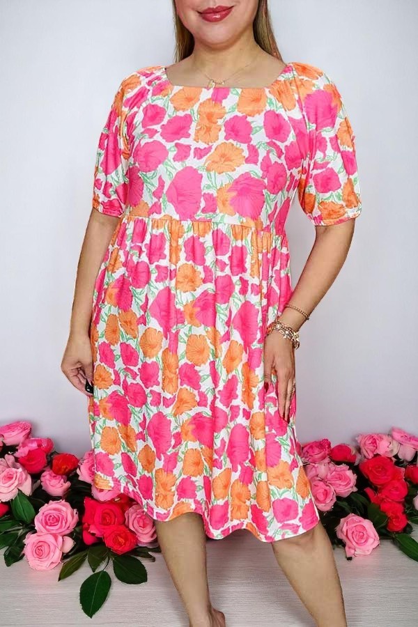 - Dress features pink and orange flower printed with square collar and short sleeves.