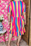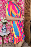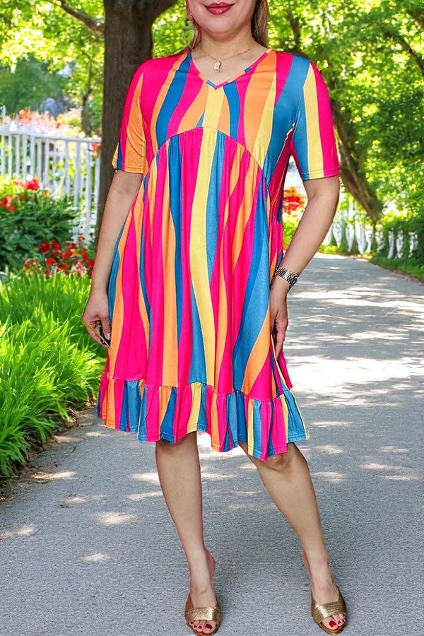 - Dress features with mulit color striped printed with high low front & short sleeves & ruffl hem.