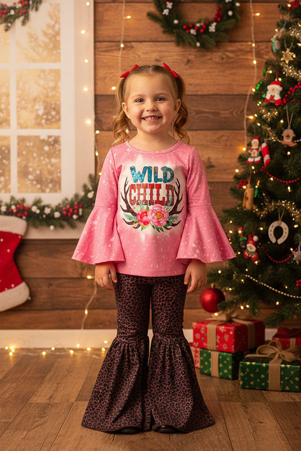 "WILD CHILD" & Floral prints top leopard bell bottom 2pc girls sets XCH0013-9H (A10S1)