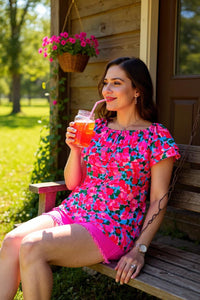 - Top features with fuchsia & green & blue floral printed on double ruffles with off shoulder styles.