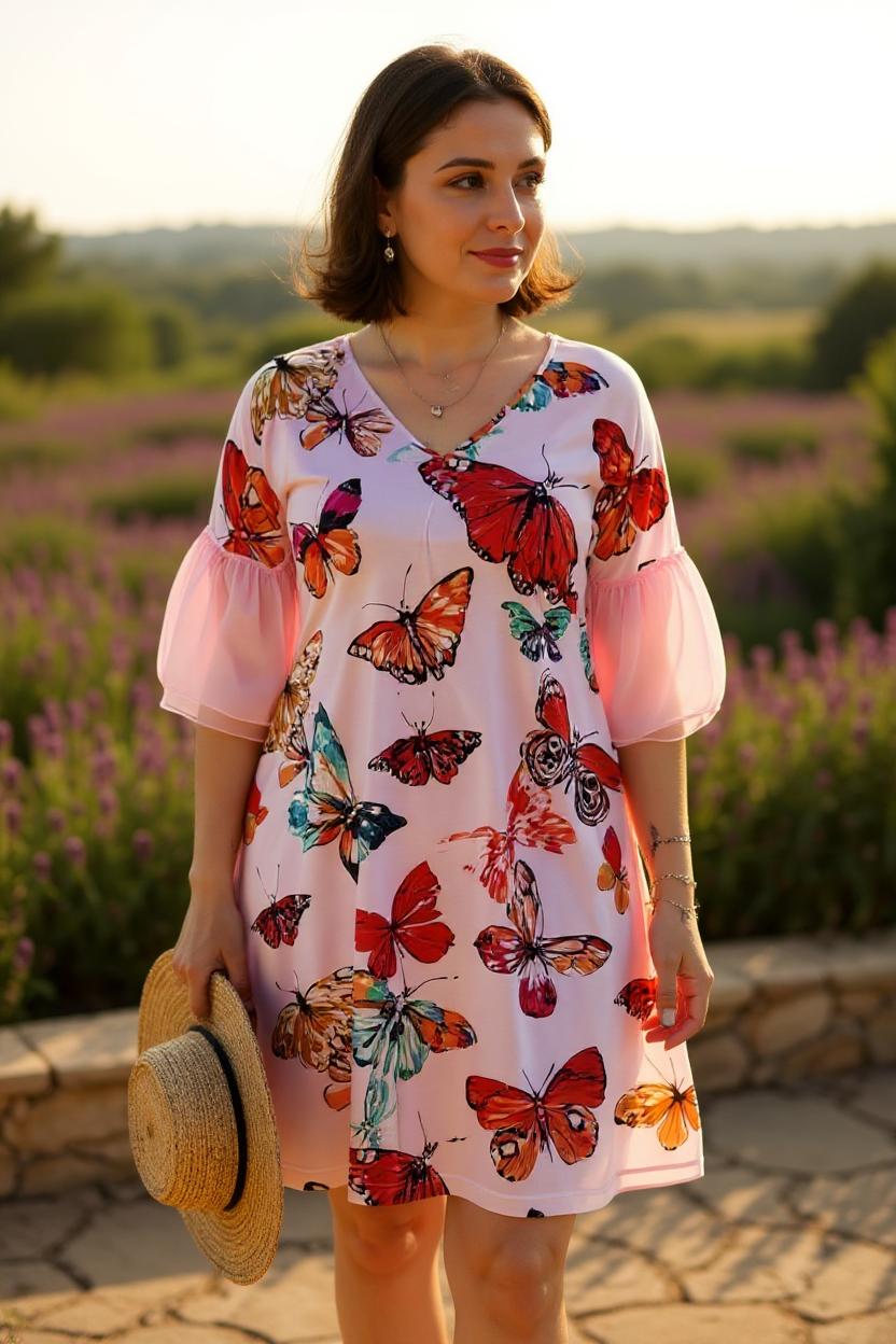 - Dress features multi color butterfly prints with ruffle drop short sleeves and v-neckline with pockets.