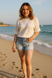 • Shorts features with slolid color blue denim washed fabric & ripped & pockets & pearls. zipper inside.