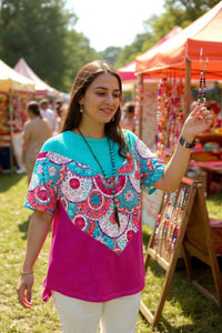 - Top features turquoise & prints & fuchsia color block with short sleeves.