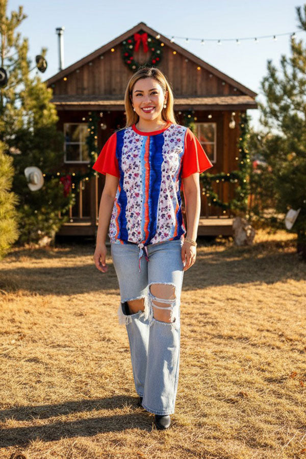 - Tops features with multi color tie dye & floral printed with red short sleeves and tied bow at front hem.