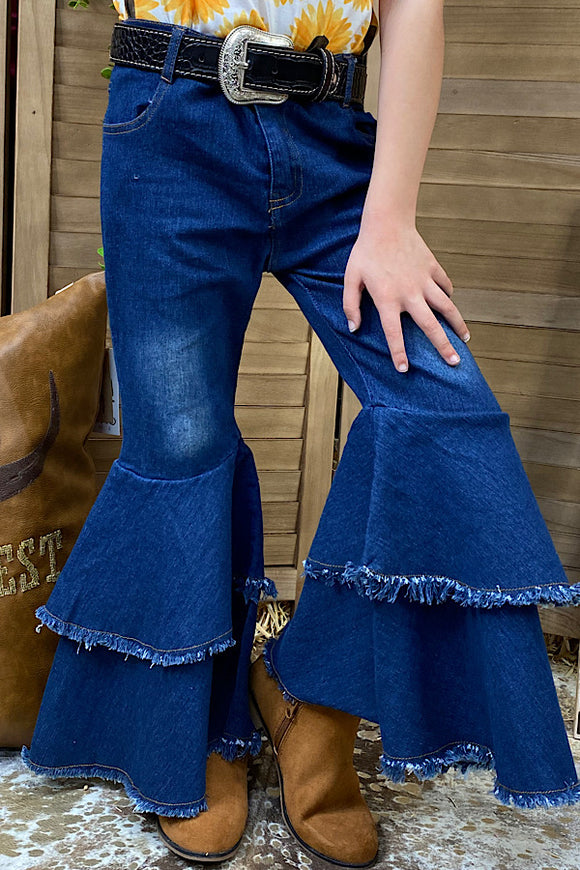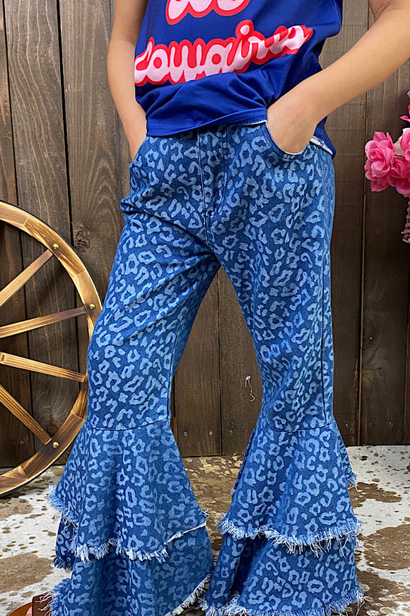 Leopard printed blue denim bell bottom girl jeans DLH2522