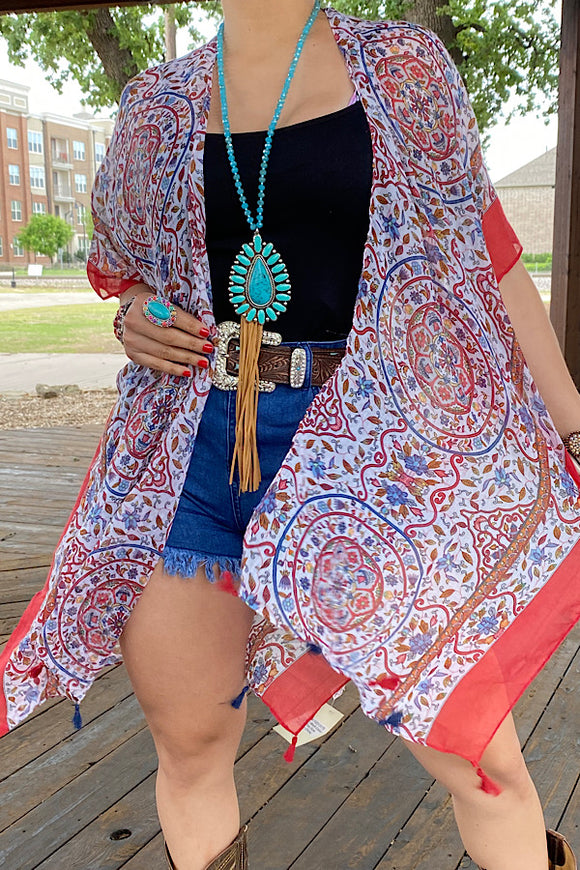 Soft duster wholesale Teal/Orange paisley printed kimono w/tassels YZ170283