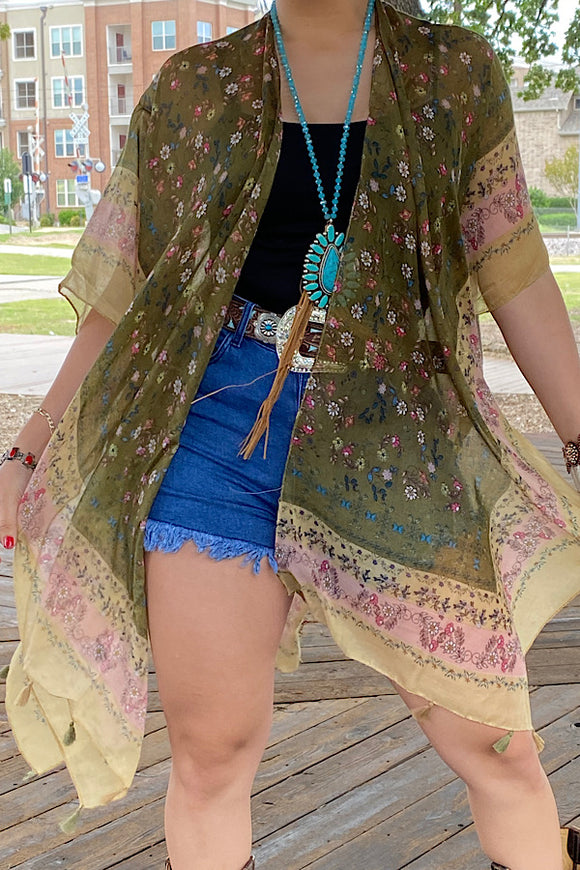 Floral duster wholesale Green floral printed kimono with/tassels YZ191003