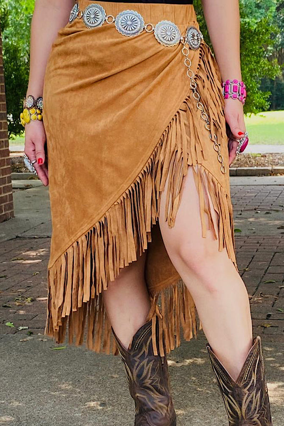 Plus size tan suede fringe tassel women skirt XCH13467S IS18